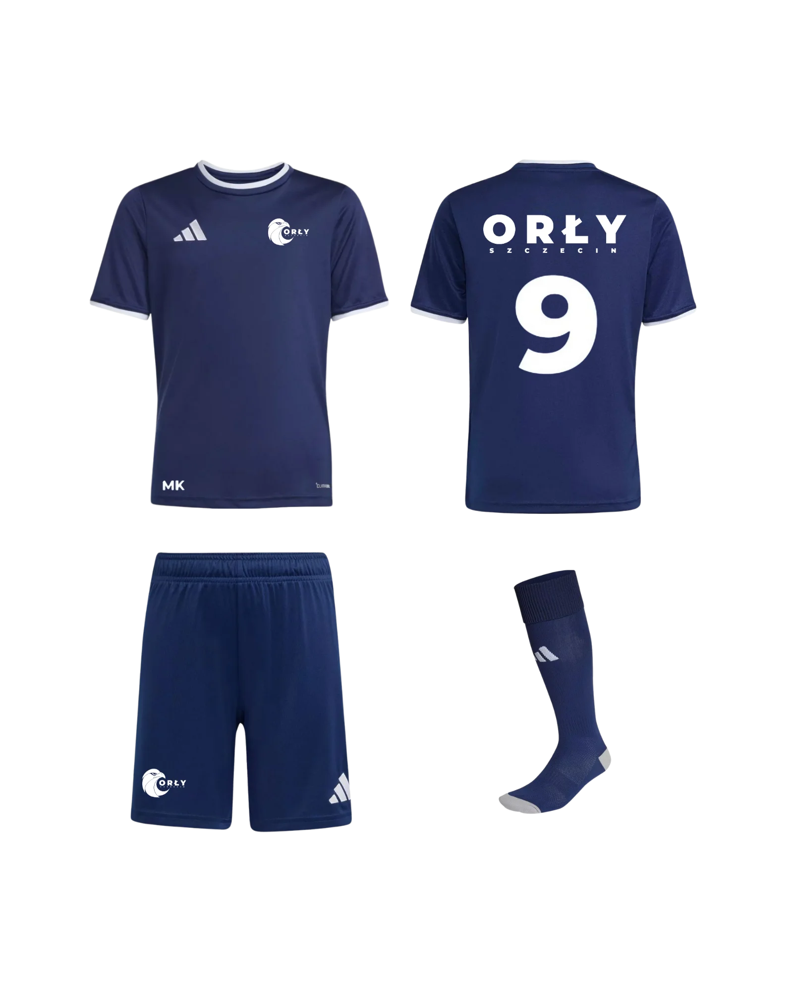 Stylowy i funkcjonalny strój treningowy w zestawie: koszulka, spodenki oraz getry. Wykonany z lekkiego, oddychającego materiału, zapewnia komfort podczas treningów i meczów. Nowoczesny design z możliwością personalizacji numeru.